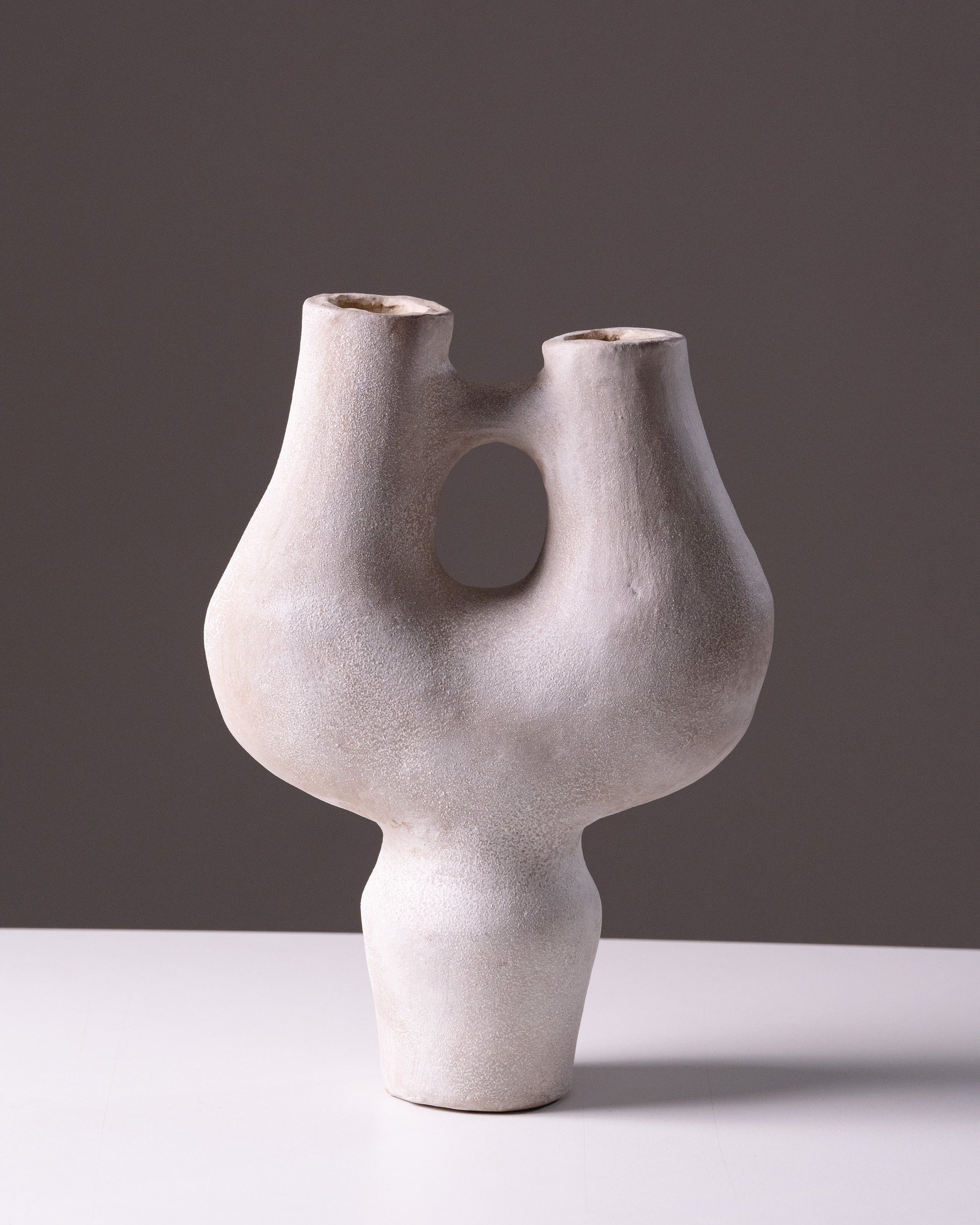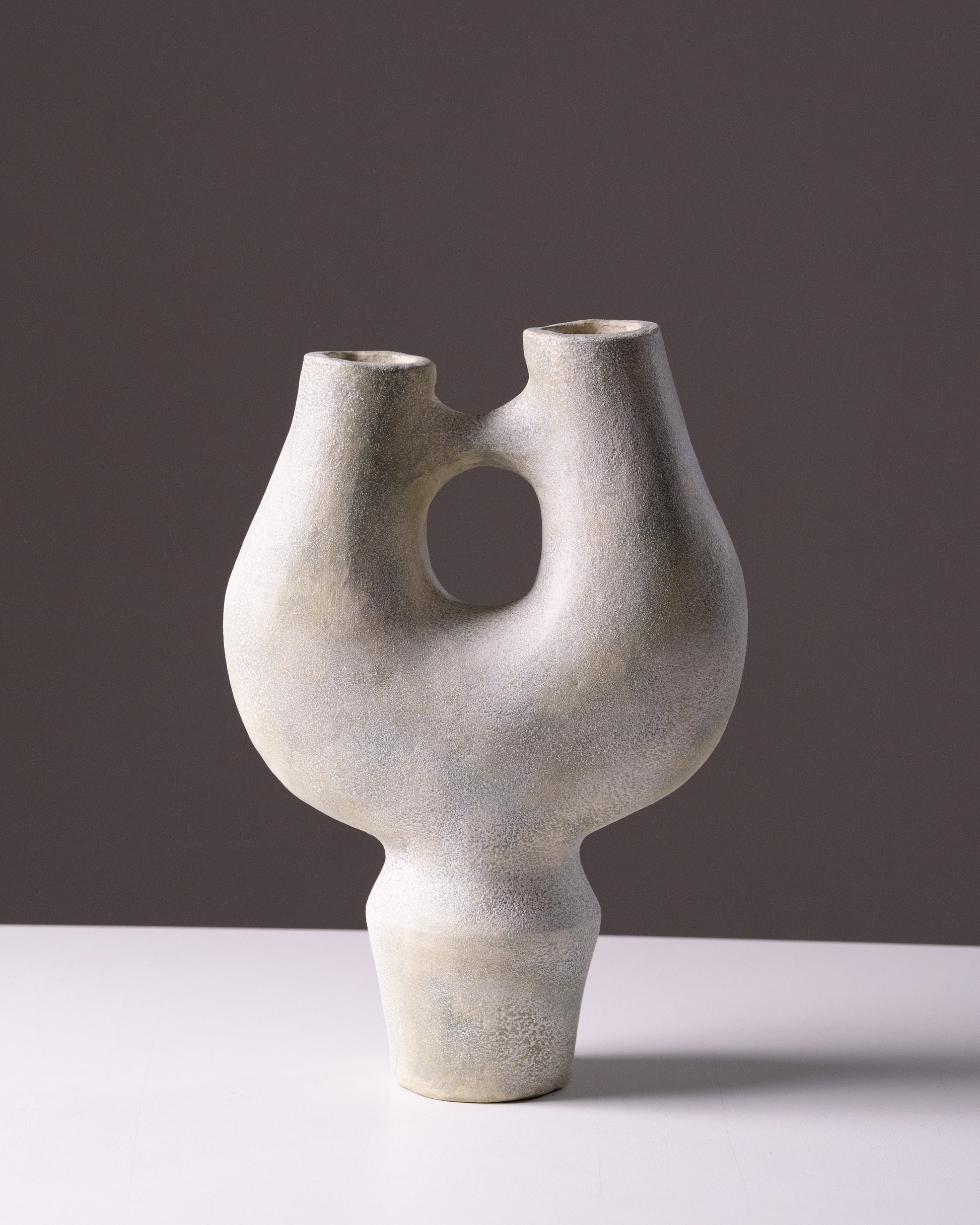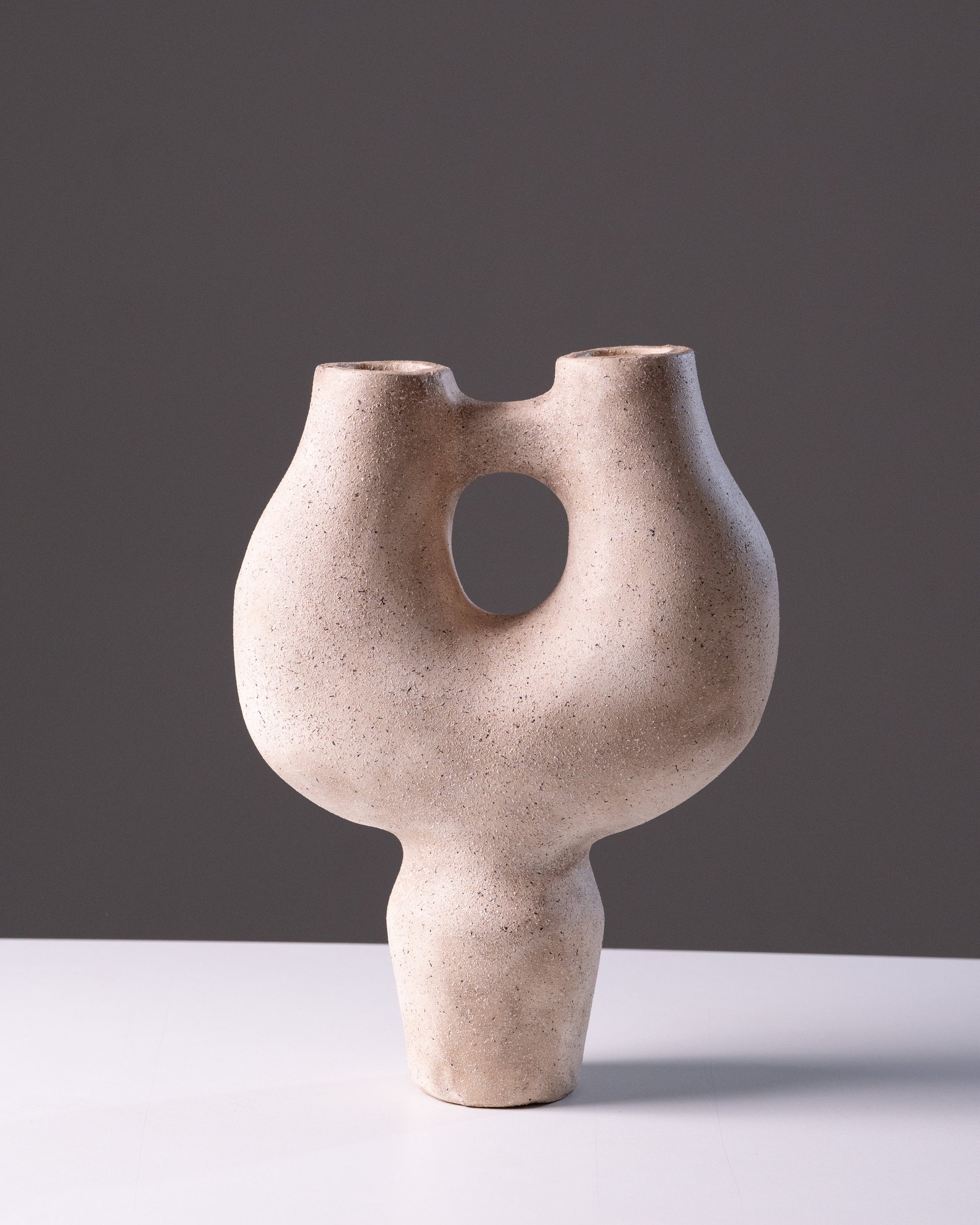 Pieza decorativa de diseño minimalista y orgánico. Su forma redondeada y apertura central aportan armonía y equilibrio visual. Con acabado mate y tonos suaves, es ideal para espacios modernos, nórdicos o contemporáneos.