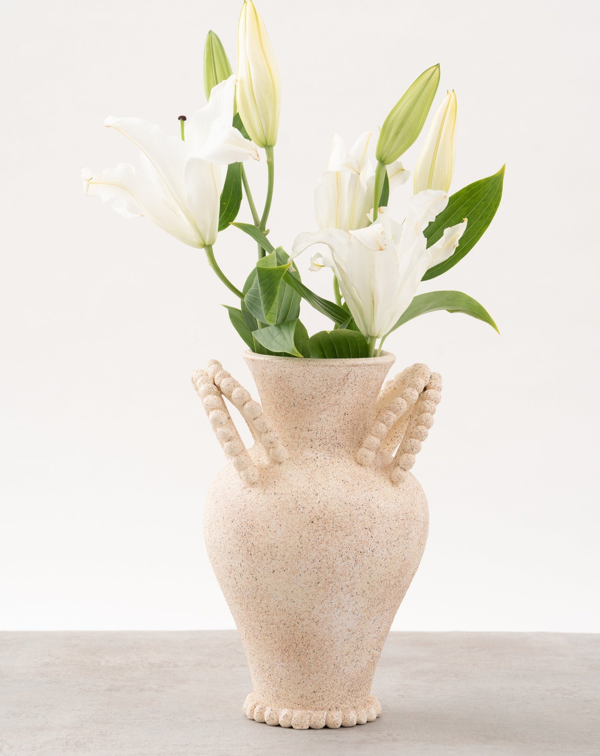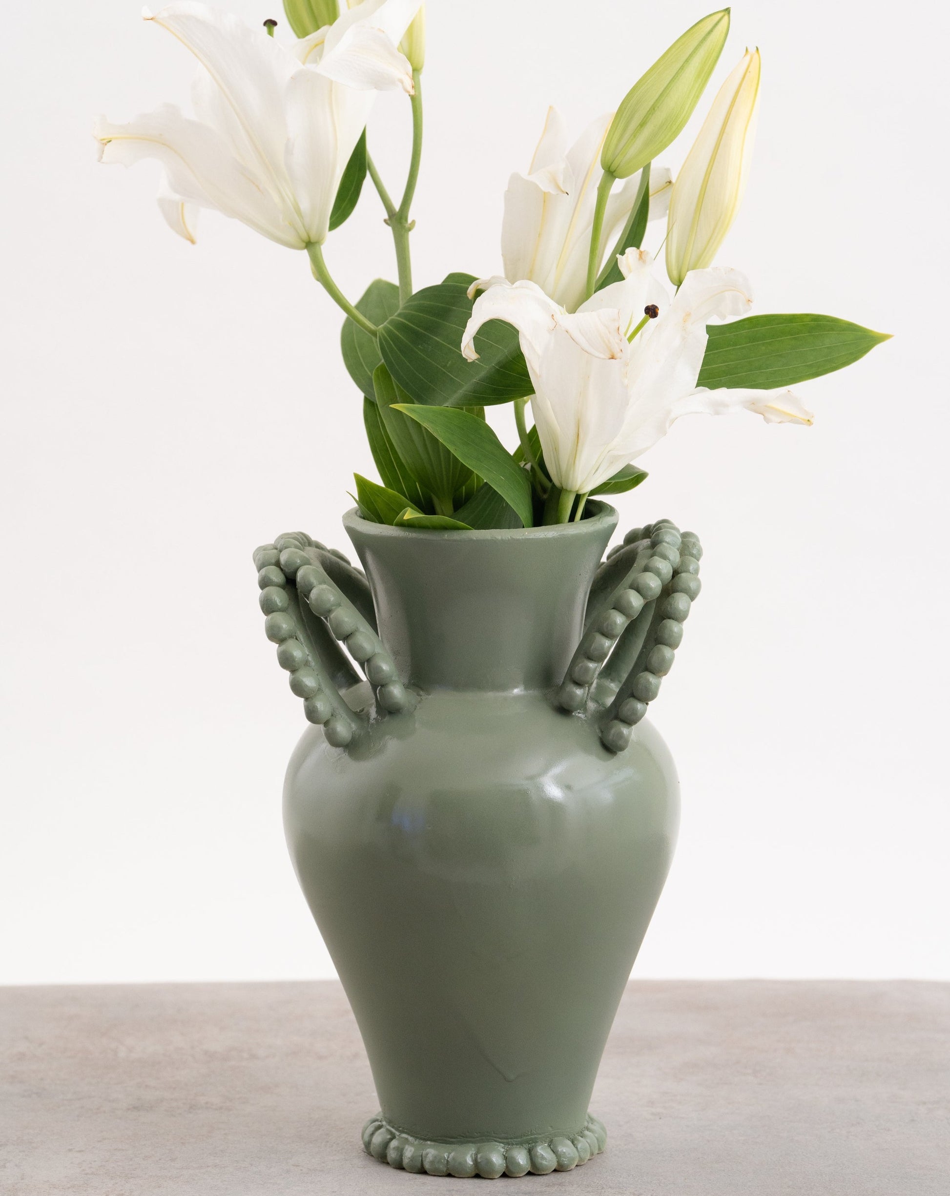 Jarrón de inspiración francesa con dos mancuernas a cada lado y pequeñas esferas decorativas que rodean su contorno. Una pieza con aire clásico y un toque artesanal, ideal para añadir elegancia y textura al espacio.