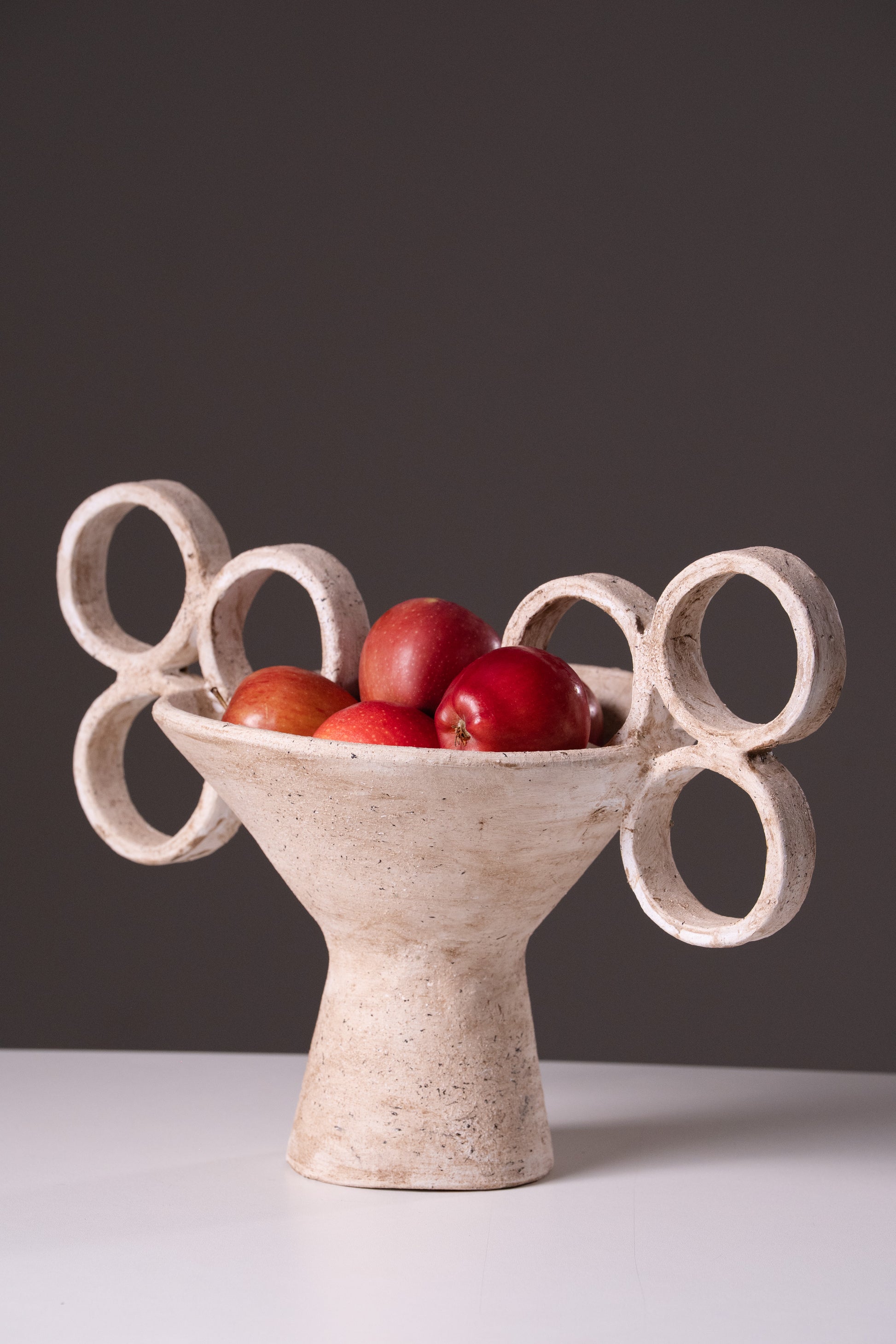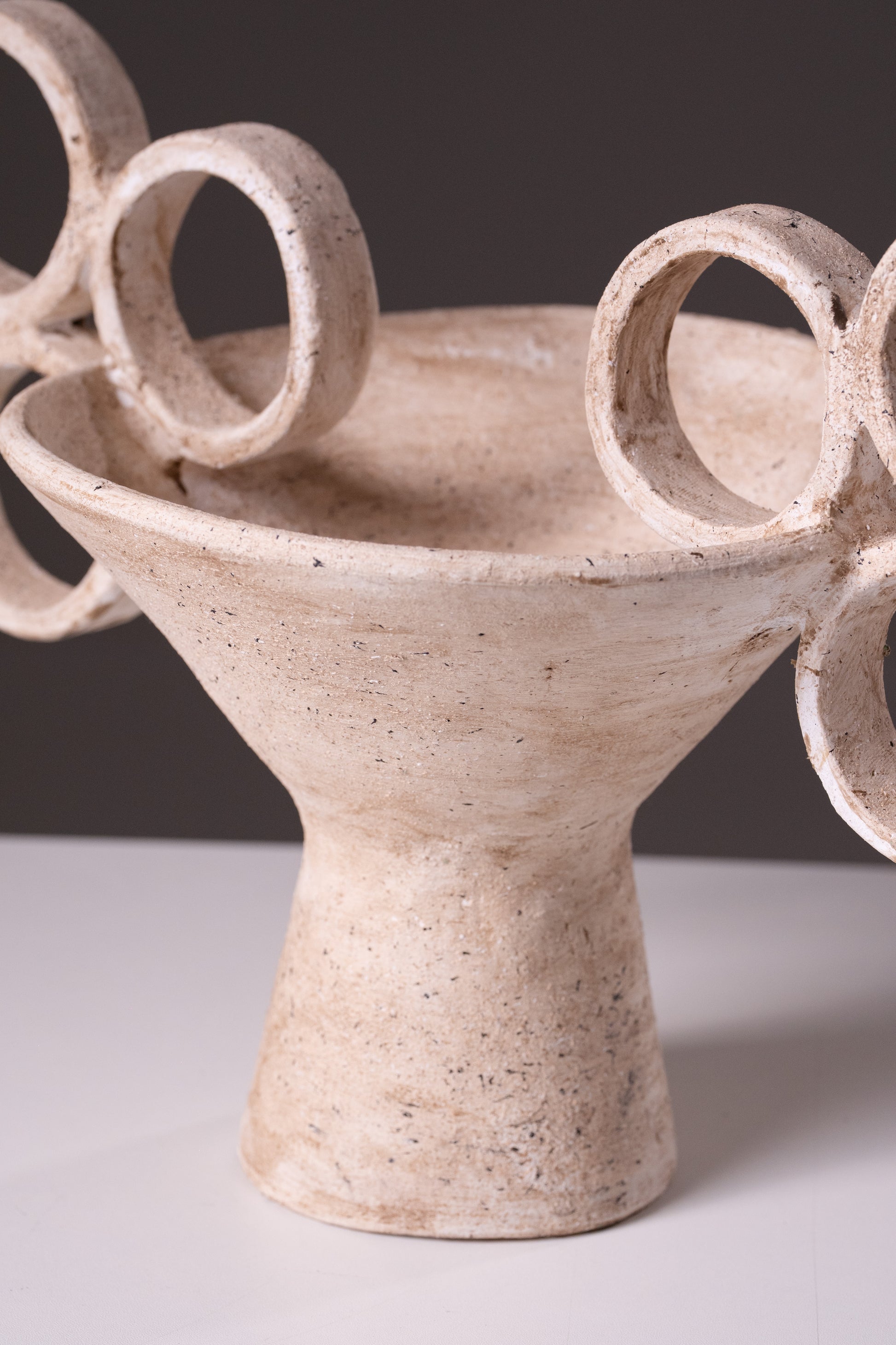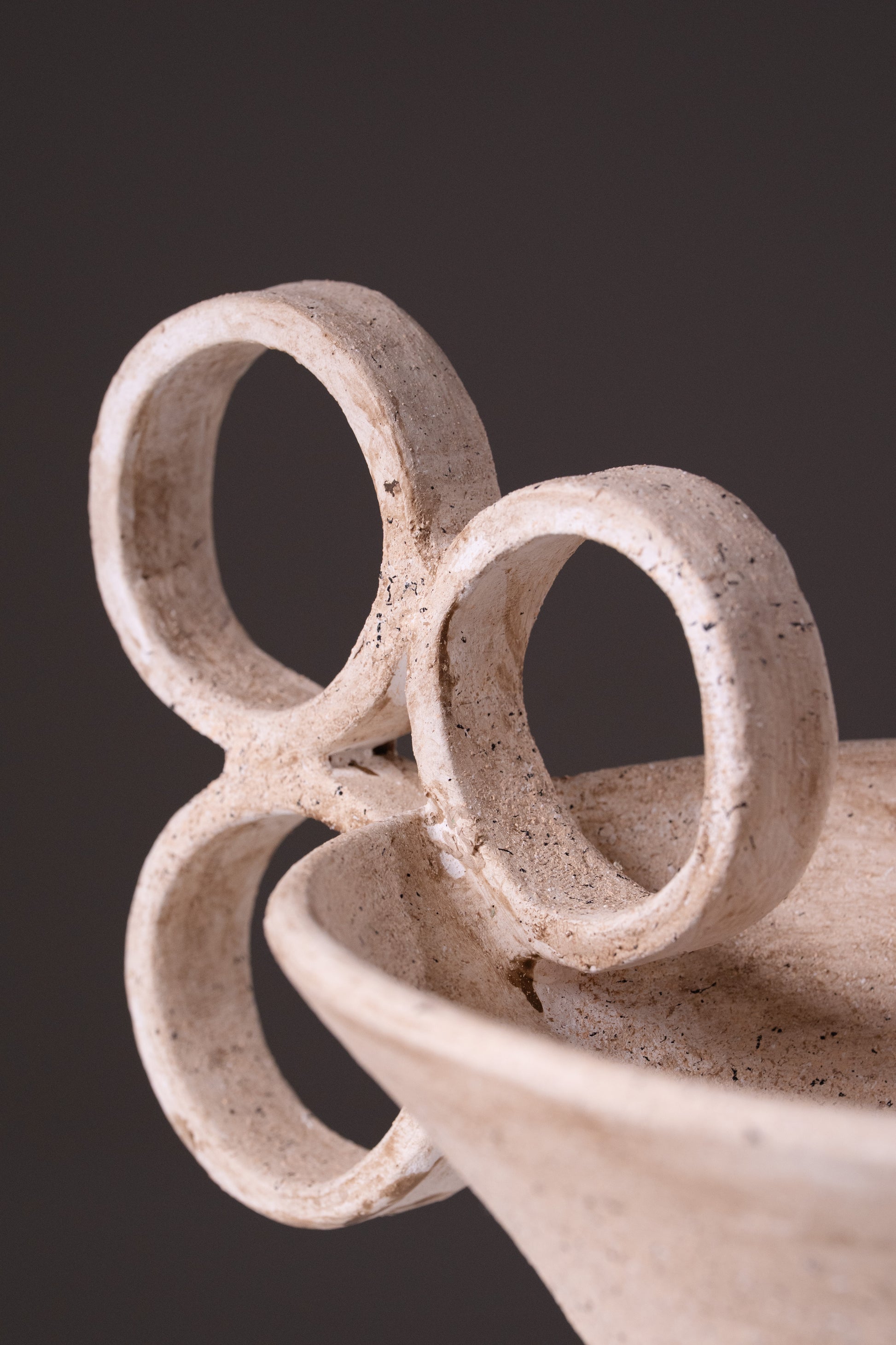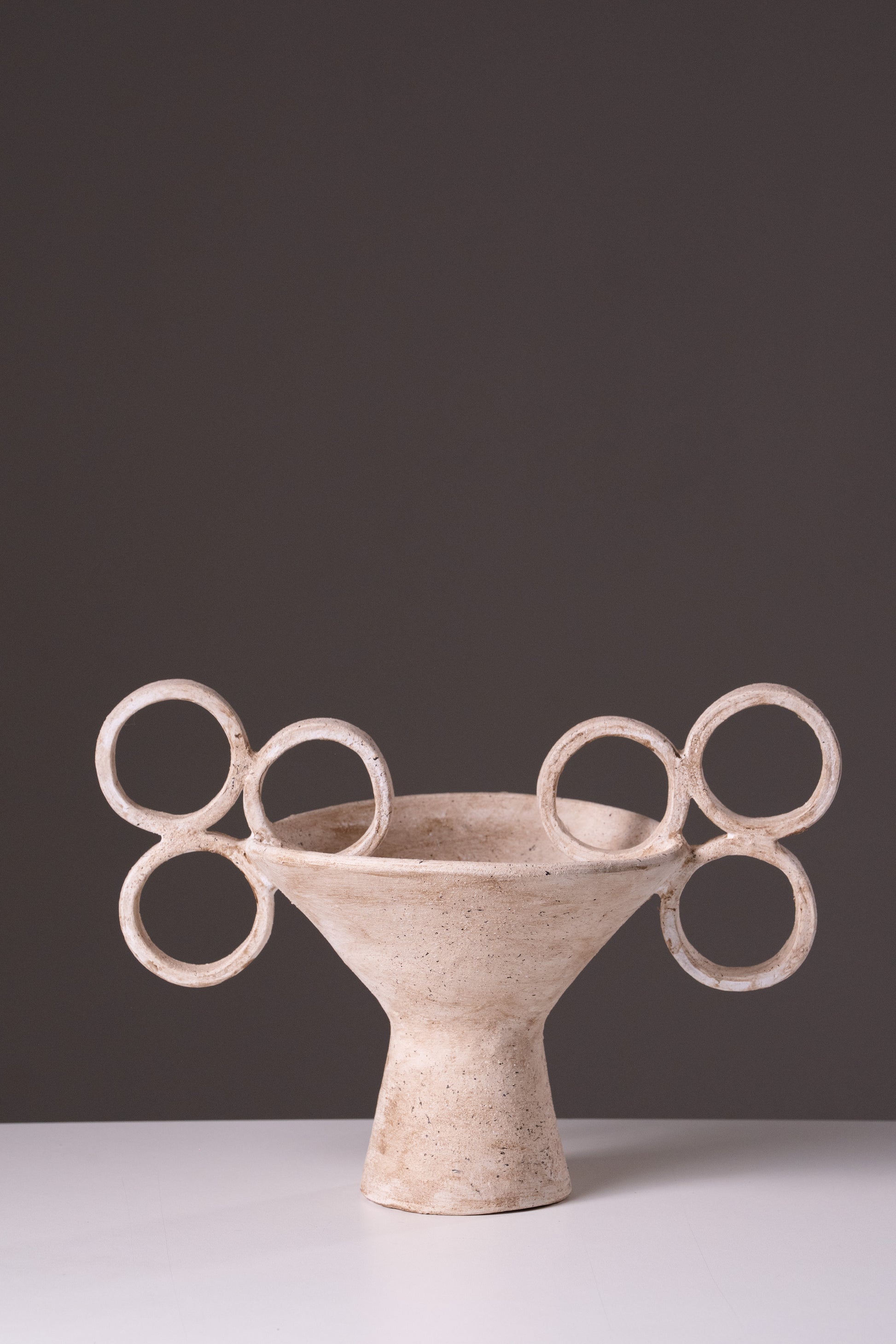 Jarrón Amman de silueta simétrica con tres círculos redondos a cada lado que aportan balance visual y un diseño escultórico. Su forma sólida y presencia imponente lo convierten en una pieza central ideal para espacios amplios, donde destaca como una obra de arte funcional que armoniza modernidad y expresión estética.