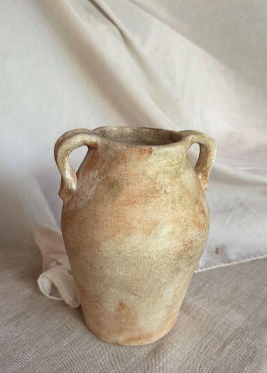 Jarrón artesanal con acabado rústico y asas dobles. Su forma clásica y textura natural lo convierten en una pieza atemporal y versátil.