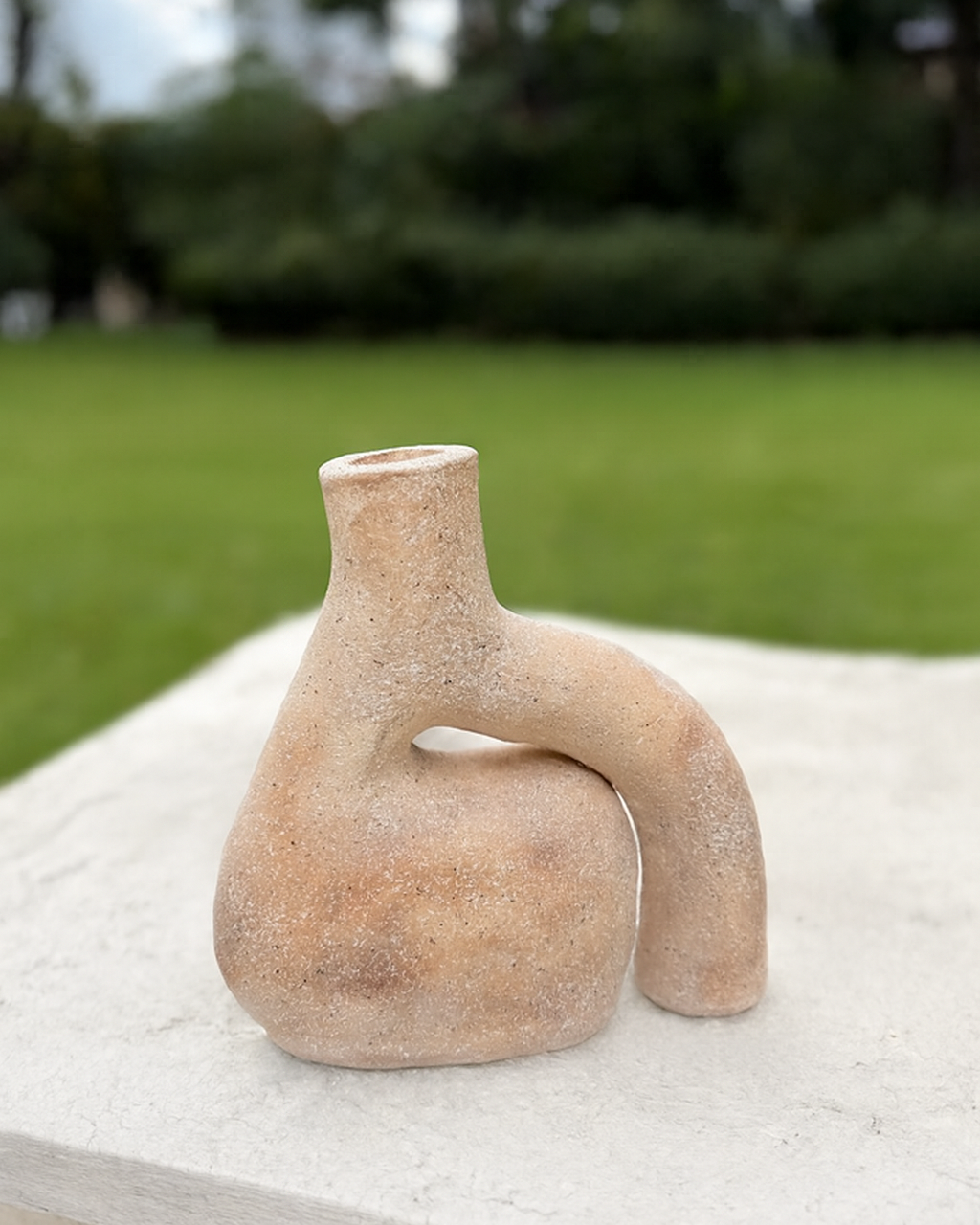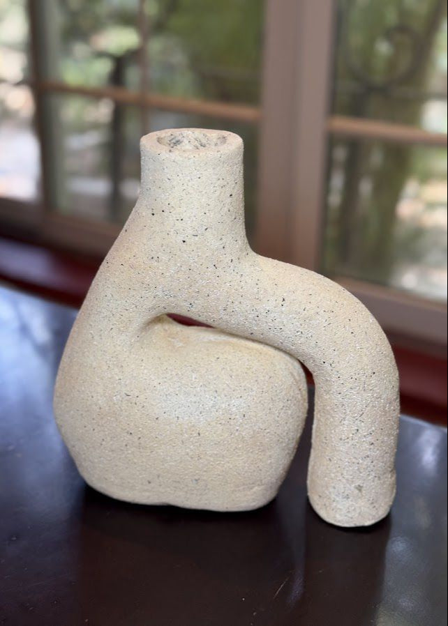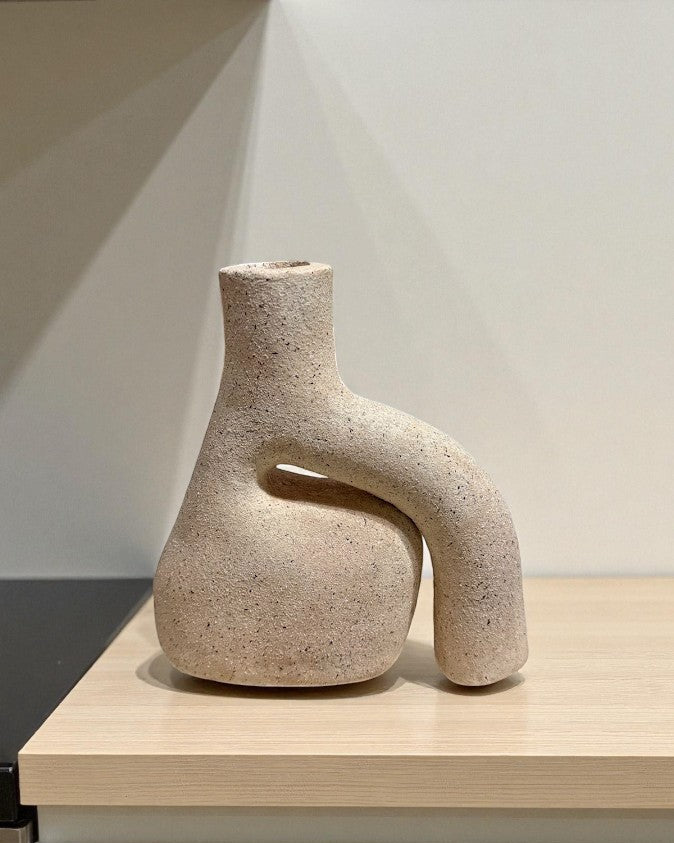 Jarrón escultórico de barro con diseño orgánico y contemporáneo. Su forma curva y fluida crea una sensación de movimiento, convirtiéndolo en una pieza única que fusiona arte y funcionalidad. Ideal como acento decorativo en espacios modernos.